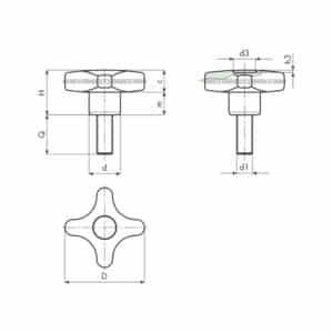 Poignée en croix en acier inoxydable A2 avec filetage mâle, sablée