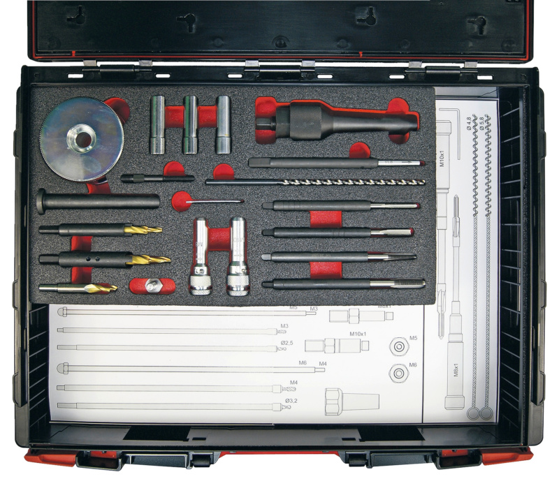 27-piece set for removing glow plugs if the drive hex is broken. Glow plug thread in the cylinder head is retained.