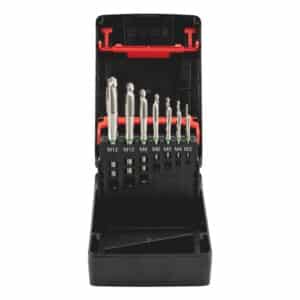 Se compose de forets métal de précision et de tarauds pour trou débouchant à bague verte pour le traitement des aciers alliés et fortement alliés (aciers inoxydables), ainsi que des aciers résistants à la rouille et résistants à l’acide. Convient également pour le traitement des aciers classiques d’une résistance maximale de 850 N/mm². Disponible dans la cassette système ORSY®.