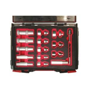 14 pièces. Permet aux professionnels de poser des capteurs de stationnement sur des véhicules non équipés ou sur un pare-chocs neuf, par exemple, en cas de remplacement après un accident, à condition qu’il n’y ait pas de perçage de positionnement en sortie d’usine.