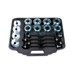 6 pièces. Jeu équipé de tous les manchons de pression et toutes les pièces de pression pour le travail sur les fusées de roues, d’essieu, rotules et silent blocs.