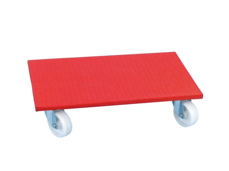 Le panneau de contreplaqué en hêtre multiplis de 18 mm d’épaisseur est fixé sur des roues pivotantes en plastique, chacune maintenue en place par quatre vis, et permet de transporter des charges pesant jusqu’à 500 kg